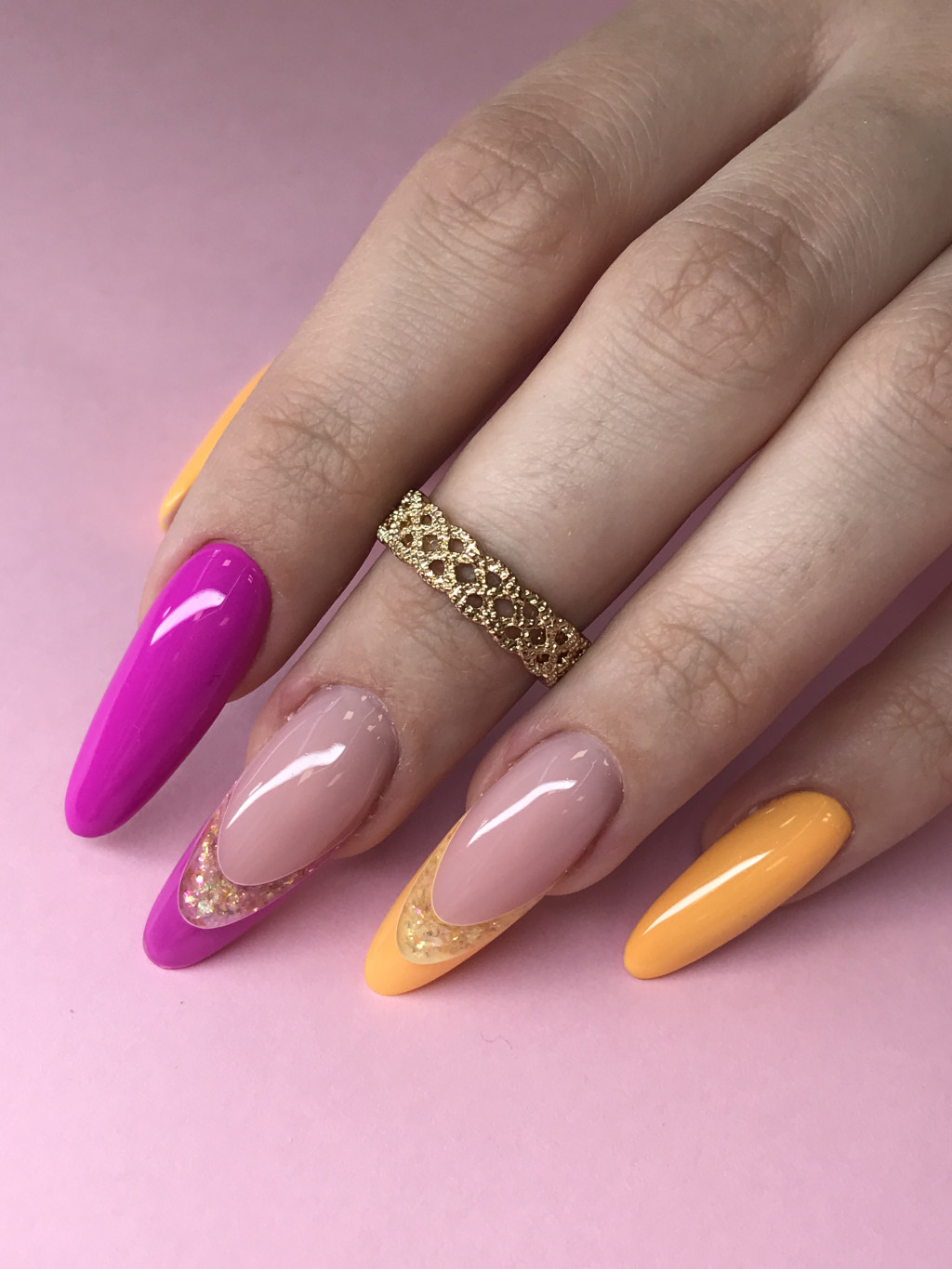 4. Culoarea: Aplică un strat subțire de ojă semipermanentă și polimerizează. Repetă pentru al doilea strat și polimerizează din nou.